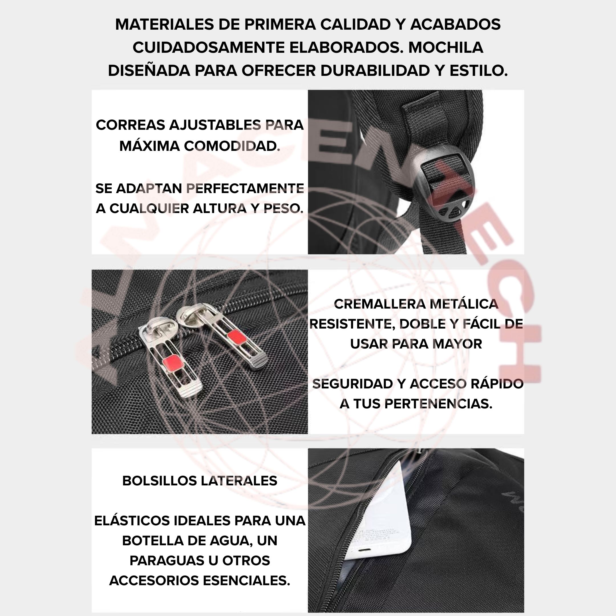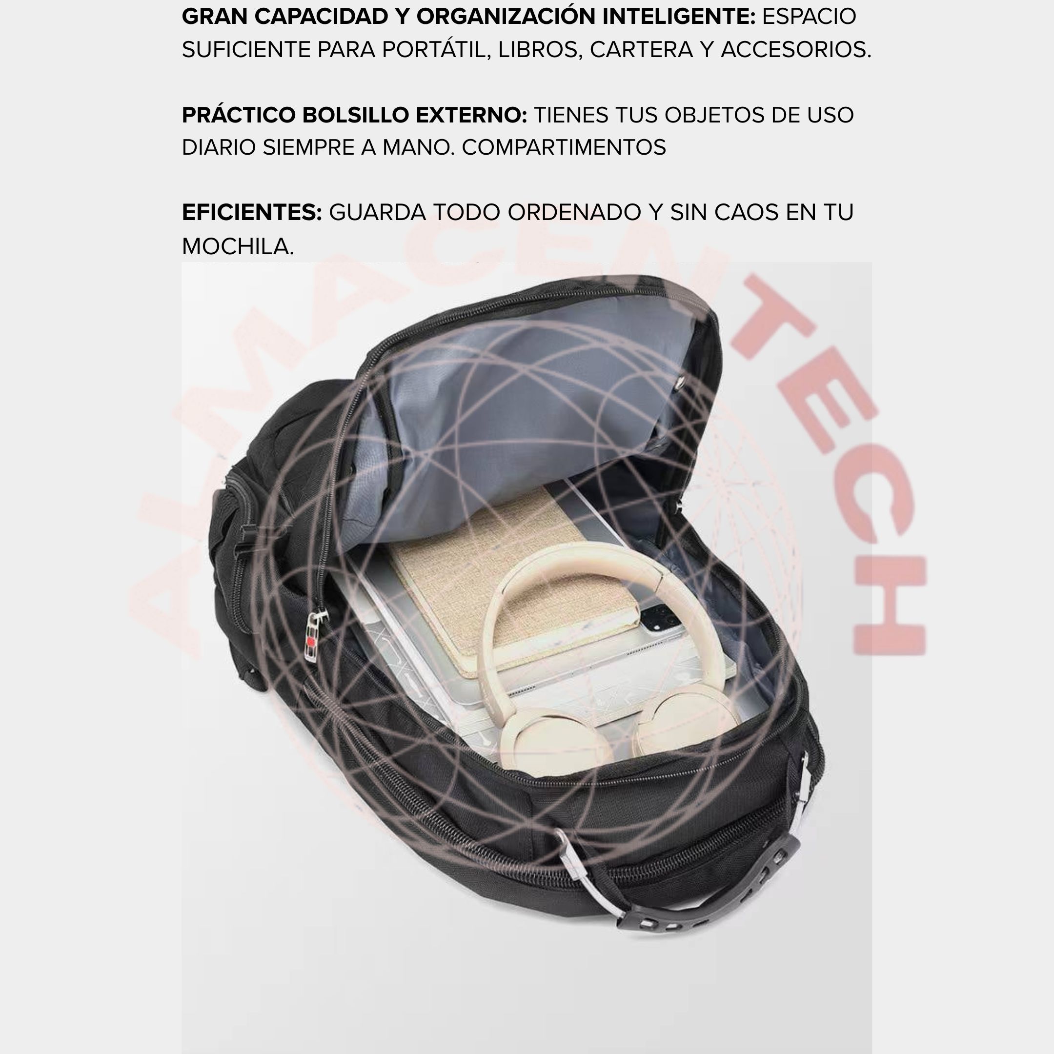 La mochila incluye todo lo necesario para mantener tus objetos seguros y accesibles: