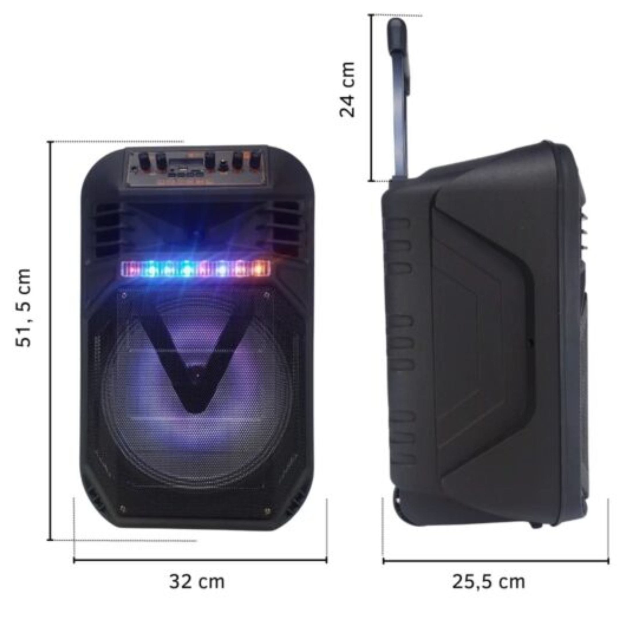 Su batería recargable permite disfrutar de la música sin depender de enchufes, y la manija incorporada hace que sea fácil de transportar a cualquier lugar. Para completar la experiencia, el parlante cuenta con luces LED integradas, que aportan un efecto visual atractivo y crean un ambiente festivo ideal para celebraciones.