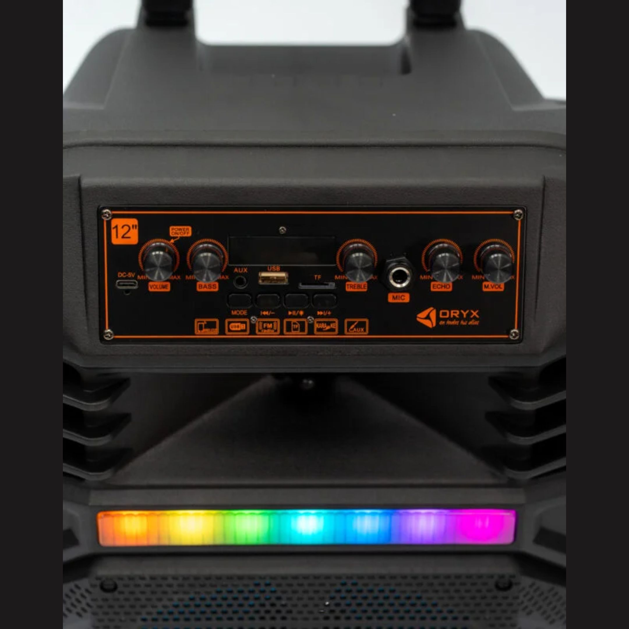 El Oryx Tokyo 12″ también cuenta con múltiples opciones de reproducción, incluyendo radio FM, entrada USB, lector de tarjeta SD y entrada Aux IN, brindando total libertad para escuchar música desde distintos dispositivos. Además, incorpora sistema TWS, que permite enlazar dos parlantes compatibles para lograr un sonido estéreo más potente y envolvente.
